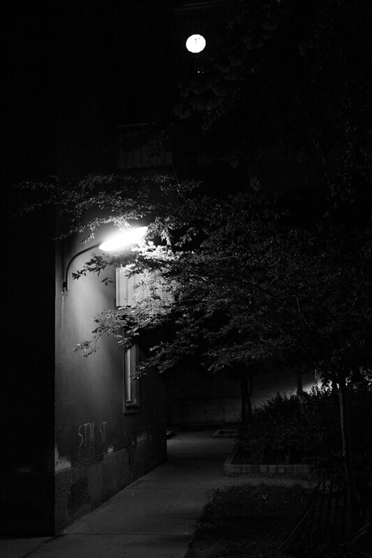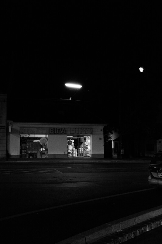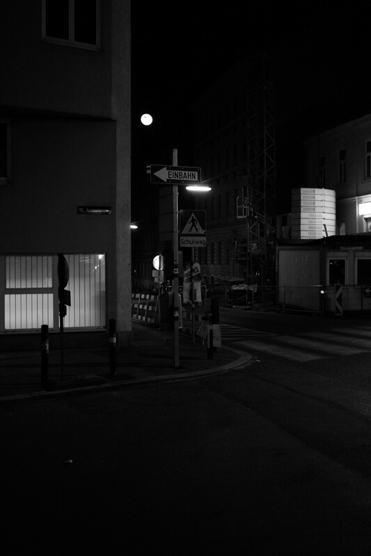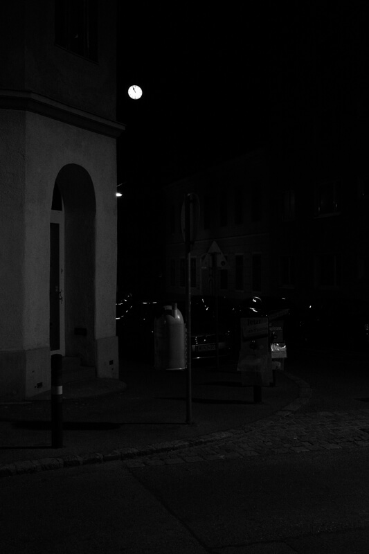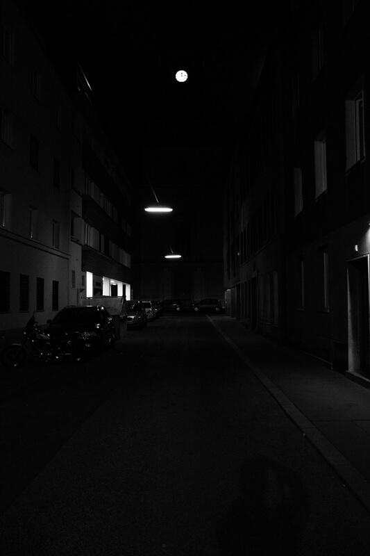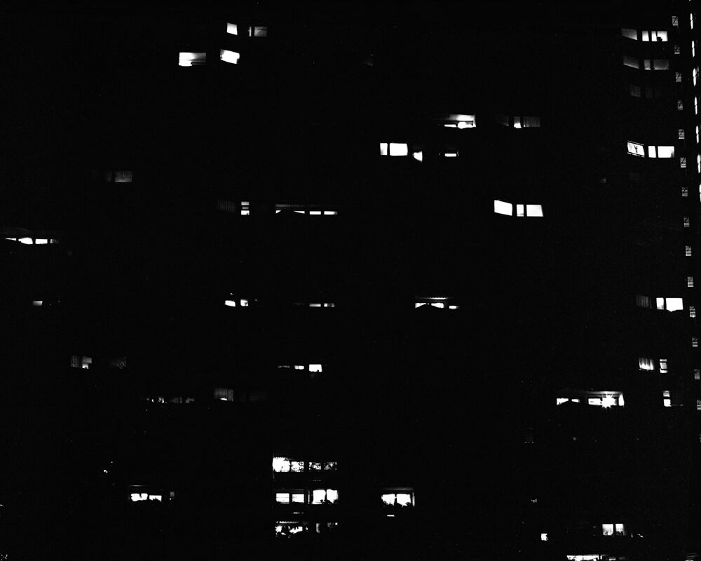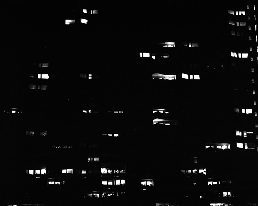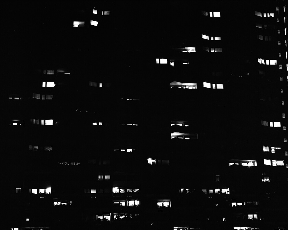 I press the release button to expose the film. The building disappears in the dark of the night, each window lights up on its own. Separated from the context, brought to- gether by the image frame. Just like the residents of the building, they have nothing to do with each other. If someone actuates the light switch, he subconsciously changes the overall picture. A small click triggers another overall image, which is just visible the moment it takes place. Only the direct comparison between the images makes the changes visible, which can’t be seen with pure observation. The image can be read as an abstract code, consisting of light and dark, on and off, one and zero. If you change a single small variable of a code, this can go completely unnoticed but have a strong impact on the result. As well, the arrangement of the bright windows on a black background is reminiscent of a contact sheet, in which each resident can expose one frame - the light switch becomes the shutter release.