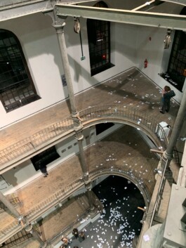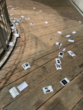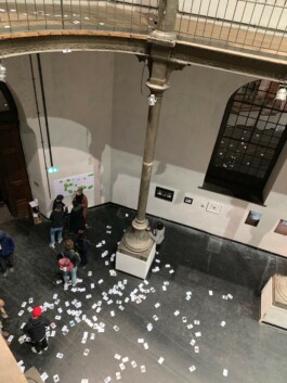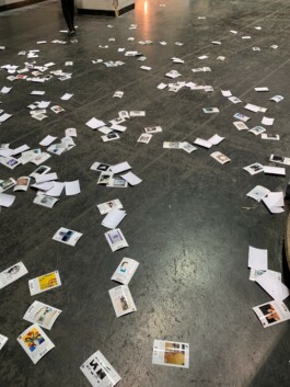 April 12th, 2019 – Opening day of the exhibition “Self-reflection in the process of art production” of the class for art and photography. Instagram posts with the hashtag #art are downloaded live and transfered to the exhibition space using a photo printer. Every picture someone has posted as #art is selected, but he mass of postings exceeds the printing capacity by far, so not all #art-works make it to the exhibition. Unfiltered, without curation, the #art postings are sailing from the digital network in a real art exhibition. The prints are scattered on the floor, the visitors collect them, look at them, throw them away again or step on them leaving their footprints.